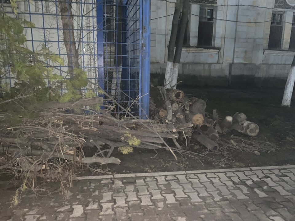 Саябақ ішінде кесілген ағаштар мен отынға дайындалған діңгектер электр трансформаторының дәл жанына үйіліп қойылған.